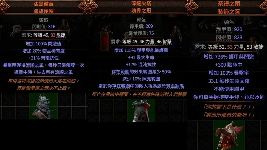【多裝備賣場、帽子、頭盔】漆黑徽章.海盜便帽流順之風)深邃尖塔.貧血魂骨之冠、祭禮之雨.裝飾之盔雙手斧錘劍