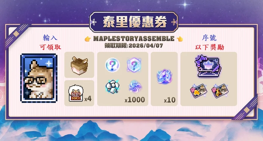 泰里序號-輸入"MaplestoryAssemble"可領取到圖片上豐富道具