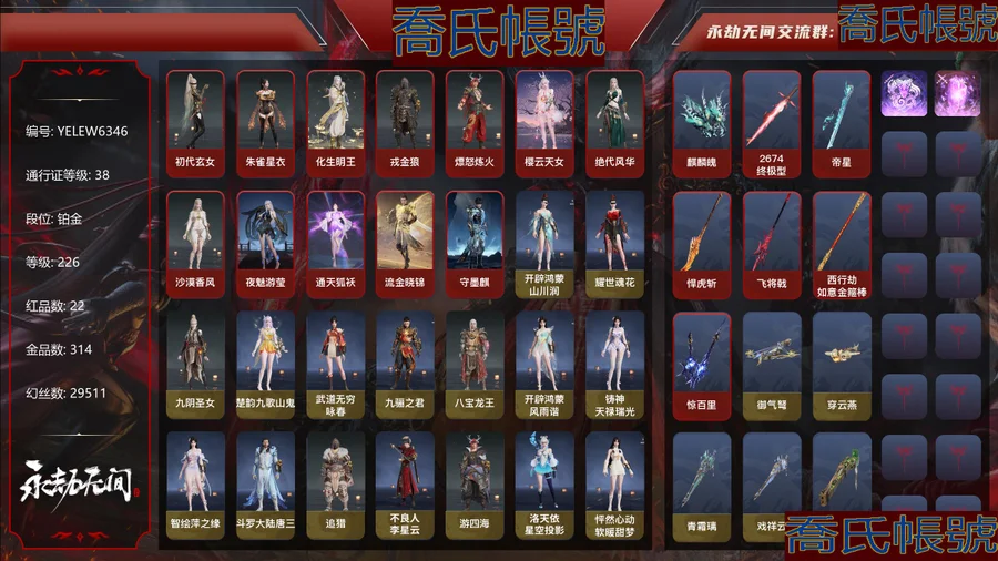 【OBYELEW634642】22紅314金|等級226|鉑金|幻絲29511|金磚559|通行證Lv.38 紅色神品:初代玄女,朱雀星衣,化生明王,戎金狼,熛怒煉火,櫻雲天女,絕代風華,沙漠香風,夜魅遊瑩,通天狐襖,流金曉錦,守墨麒,麒麟魄,2674·終極型,帝星,悍虎斬,飛將戟,西行劫·如意金箍棒,驚百里,初櫻綺夢發 角色金色皮膚:開闢鴻蒙·山川潤,耀世魂花,九陰聖女,楚韻九歌·山鬼,武道無窮·詠春,九驪之君,八寶龍王,開闢鴻蒙·風雨諧,鑄神·天祿瑞光,智繪·萍之緣,鬥羅大陸·唐三,追獵,不良人·李星雲,遊四海,洛天依·星空投影,怦然心動·軟暖甜夢,春日序曲·晨風,夏日派對·高校水著,御宅羅夢,清雅少女,貴胄少女,狩獵都市·暗夜利刃,妖刀姬,封神錄·敖丙,阿娜希塔,楚韻九歌·湘夫人,觀山海·文鰩,赤霧煙霞,伏波龍女,怒浪,開闢鴻蒙·金戈止,西行劫·楊戩,弘毅袍,龍之影·過江龍,梨園傳奇·柳生,封神錄·申公豹,祿運玉霄,封神錄·龍吉公主,花之傾奇,浣煙紗,璨銀魔梟,瀚海蒼鷹,福瑞天澤,葫蘆兄弟·蛤蟆頭領,觀山海·秋神蓐收,西行劫·悟空,封神錄·哪吒,觀山海·冬神玄冥,封神錄·妲己,春日序曲·赤羽,楚韻九歌·雲中君,赤誠心,封神錄·姜子牙,雲間影,雪鈴綺歌,狩獵都市·雷行獵手 髮型金色皮膚:燦蓮花發,鬥羅大陸·海神發,逆水寒·江海發,(挑染)騰煙發,(挑染)騰煙發,(挑染)櫻舞發,木棉發,怦然心動·戀歌發,(挑染)填海發,封神錄·紅鸞星發,排霜發,翔鸞發,觀山海·天刑發,(挑染)桀驁發,(挑染)宵燭發,流螢發,春日序曲·玄瑛發,封神錄·籠煙芍藥發,秀逸發,封神錄·仙風發,(挑染)風吹雪發,(挑染)逐影發,蜜語發,(挑染)牽雲霞發,狩獵都市·迅猛發 武器金色皮膚:御氣弩,穿雲燕,青霜璃,戲祥雲,螢火,雪國禮炮,兔華籠,雷落,丹鶴,凝冰魄,虎踞,迎宵,鸚鵡螺,月虹弦角,烏木弓,日輝,暝蛇引,蓮心劍雨,炎魔,天狐,虹貓藍兔七俠傳·冰魄劍,財神劍,亢龍,西行劫·紫金寶劍,壺中日月,含光承影,醉花風,拂雪絨,毅魂守,陰陽師·鬼切,雷厲,盜墓筆記·黑金古刀,斬銀河,青石猊,龍蟠,惡障,麒麟牙,劫濤·潮,觀山海·朱明,西行劫·三尖兩刃刀,靈木角,觀山海·金神鉞,劫垢·堀,長虹,建木,委蛇矛,白虹,糖果棍,冰輝,2674·貳型電漿杖,判官筆,仙舞,華夏神兵·馬首刀,青峰疊扇,騰雲歌,耀夜流華,葉底花,嘶風,鎮魔杵,精武,詭月·鏈魂,蛋仔派對·鹹魚,禍忌,破重雲 飾品金色皮膚:染紅紗,崑崙龍神冠,美團·團上頭了,觀山海·腓尾,甲辰龍,福虎帽,靈狐耳,陰陽靈狐,劫妹飛船,冰鏈,暗香,安歌帽,鮫人角,銀雪,虎絨耳,葫蘆兄弟·蛤蟆頭,觀山海·秋金,觀山海·冬稜,封神錄·傾城,夢棠,虹貓藍兔七俠傳·虹光,安樂冠,金瑛冠,虹貓藍兔七俠傳·赤龍,夜露帽,盜墓筆記·防風帽,鹿鈴角,虹貓藍兔七俠傳·寒月,虹貓藍兔七俠傳·雪團,狩獵都市·碎空龍尾 變身器:神烏造像,鎧甲勇士·帝皇俠,荊魂,西行劫·神君印,封神錄·赤蓮,攬九天 【代幣或期限道具請以實際驗號為準】【Steam】【國服】