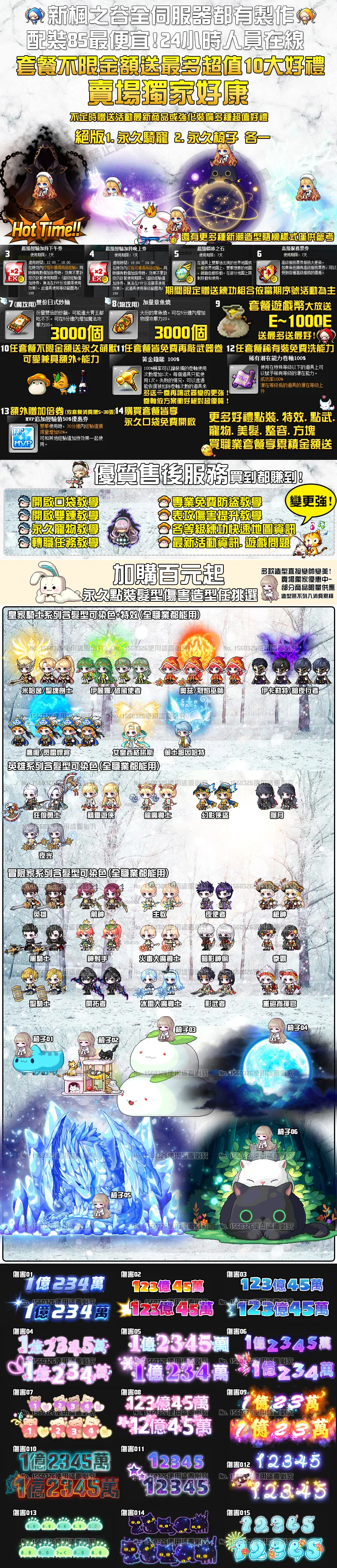 例如:伺服器:艾麗亞 職業:凱內西斯,限量款套餐,升級1.V武器+2.傳說武器+3.130魔心臟+6.升級4S頂培