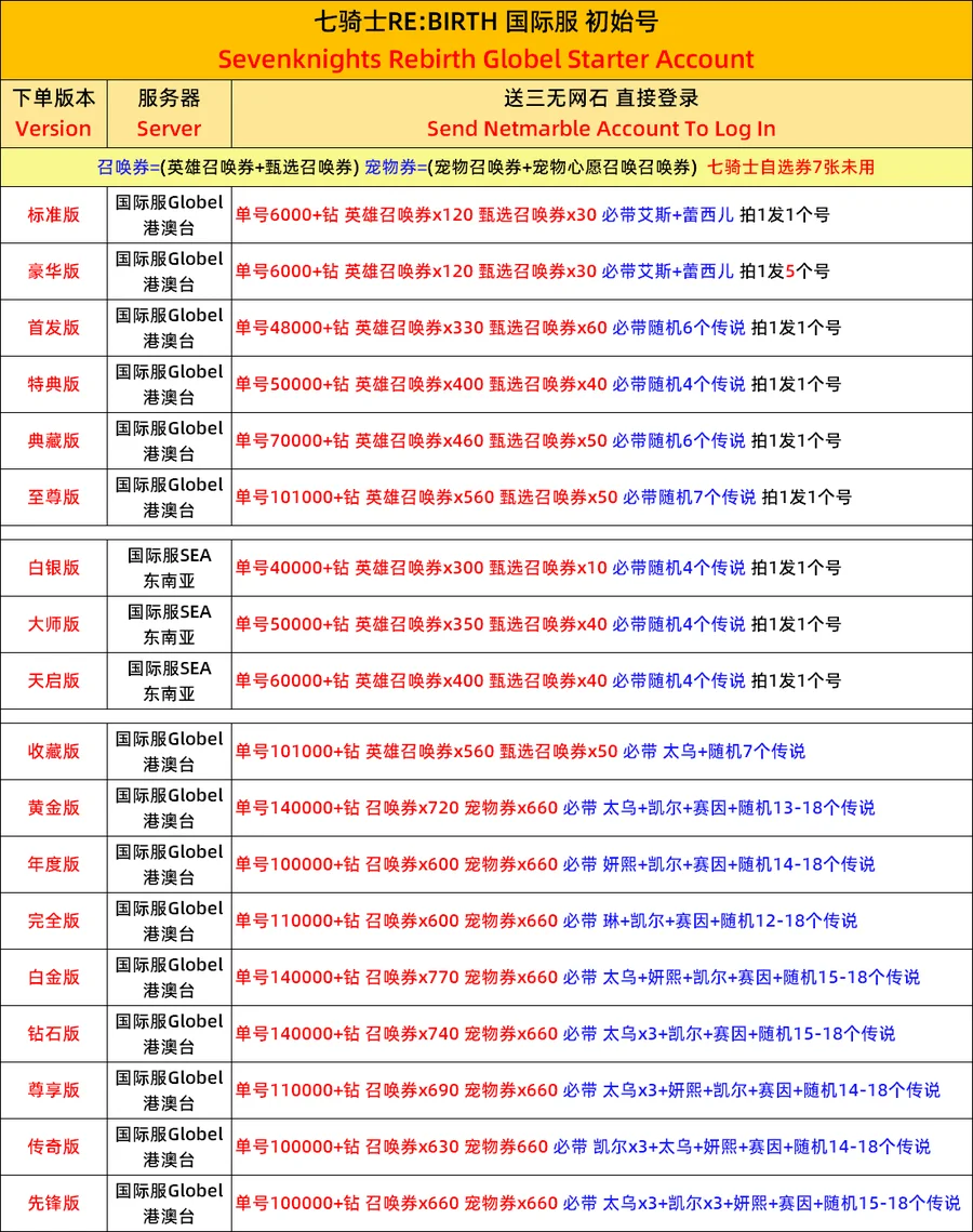 全 8591 首家 七騎士重生製版RE:BIRTH韓服國際服開局初始自抽自選初始首抽號