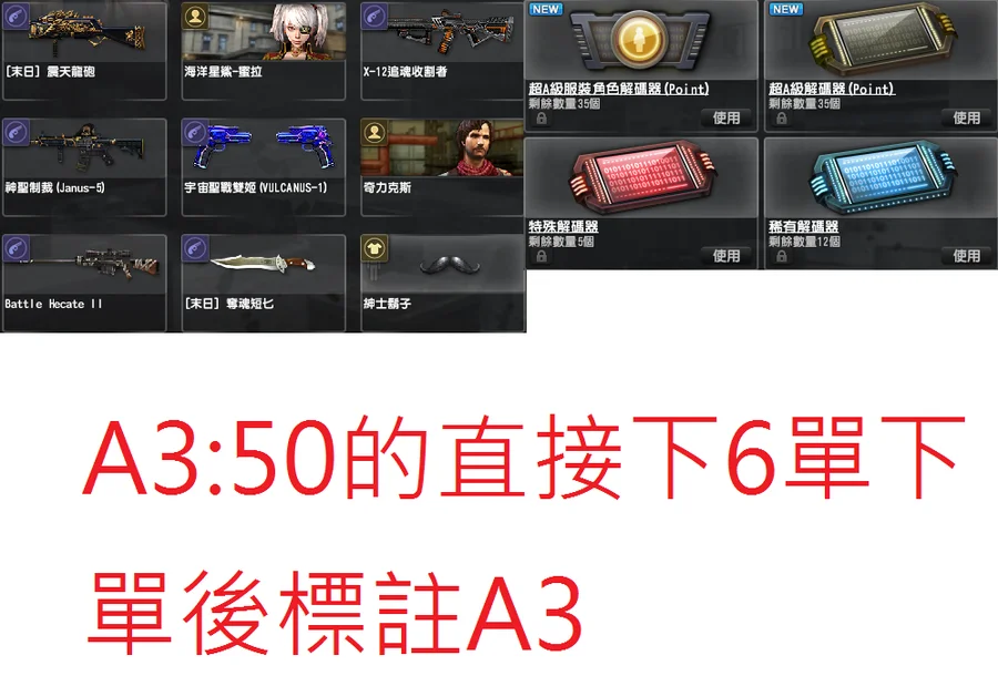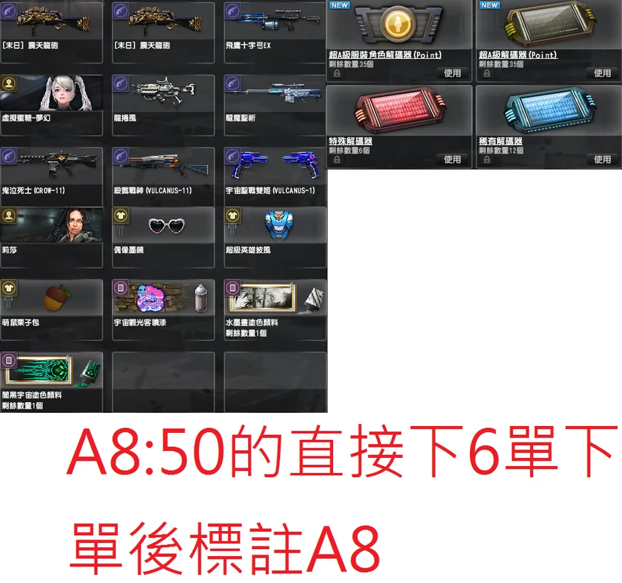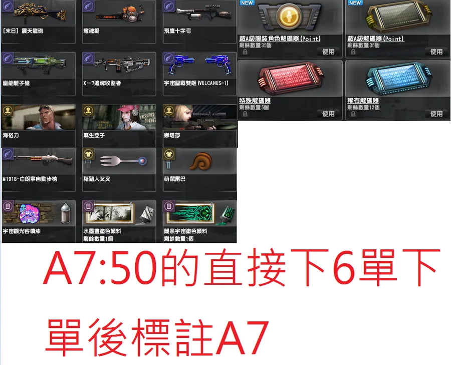 加購領航者-F2000/審判之眼-SL8 EX/龍紋K1A/閃靈獵手-M1887/藍寶LB-1000型/睏寶KB-2000型/石破天驚/火神機槍-Minigun/寂滅斷魂/黑白雙煞/紅白雙星/藍寶手榴彈/狂野戰翼/奪魂短匕/星鑽彩砲/黑暗騎士-HK23/九曲蛇劍/黑色旋風-M14/極速飆風/熾焰彩砲/雙子銀狼/雷霆終結者/光束劍/蛇姬之吻-M95/爆能脈衝/十萬伏特/一刀斷罪/超電磁砲/降妖聖靈/征服者-M60E4/雷神激光破/猴塞雷/極道狂徒/破壞者/馬爾托之鷹/深淵惡魔-KSG12/樂高火箭V2/馬爾托之鷹EX/連環殺陣-AS50/傾城/殲滅者-MG3/燃燒/藍焰之魂-SPAS12/AUG/鴨掌式手槍/病毒擴散機/霹靂悍將/斯特林刺槍/芬蘭之星-TRG/朧月/噬血榴砲-M79/Gilboa蛇吻/突擊兵蜂-MG36/煉獄之怒/MP7A1擴充版/末日審判-SL8EX/2016里約紀念版(中國)/2016里約紀念版(日本)/2016里約紀念版(印尼)/2016里約紀念版(美國)/2016里約紀念版(加拿大)/2016里約紀念版(土耳其)/2016里約紀念版(俄羅斯)/2016里約紀念版(德國)/2016里約紀念版(韓國) 任選一個永久+100t 50的直接下8件數 下單後請標註內容物 正確會發貨