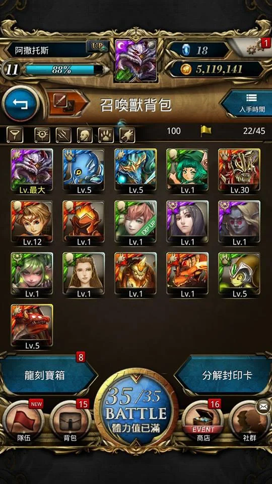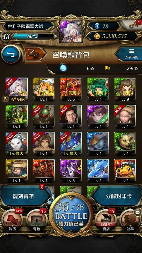 18 all max還沒用 圖名蛇夫座斯克勒(滿等滿技能) 薇兒丹蒂 薩爾瑪提亞女皇木巫 蔡文姬 道賀信天翁 米基利 袋中瘋頭 提爾火北歐 光龍使 聖果之伊登 群山中之恐怖 獅鷲 美杜莎 怒顏守護犬 光之異界龍 獎勵中卡都沒開