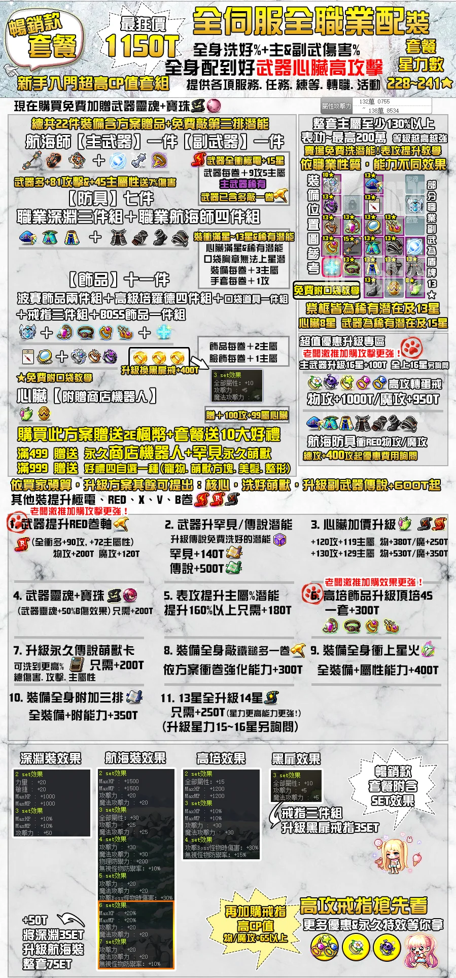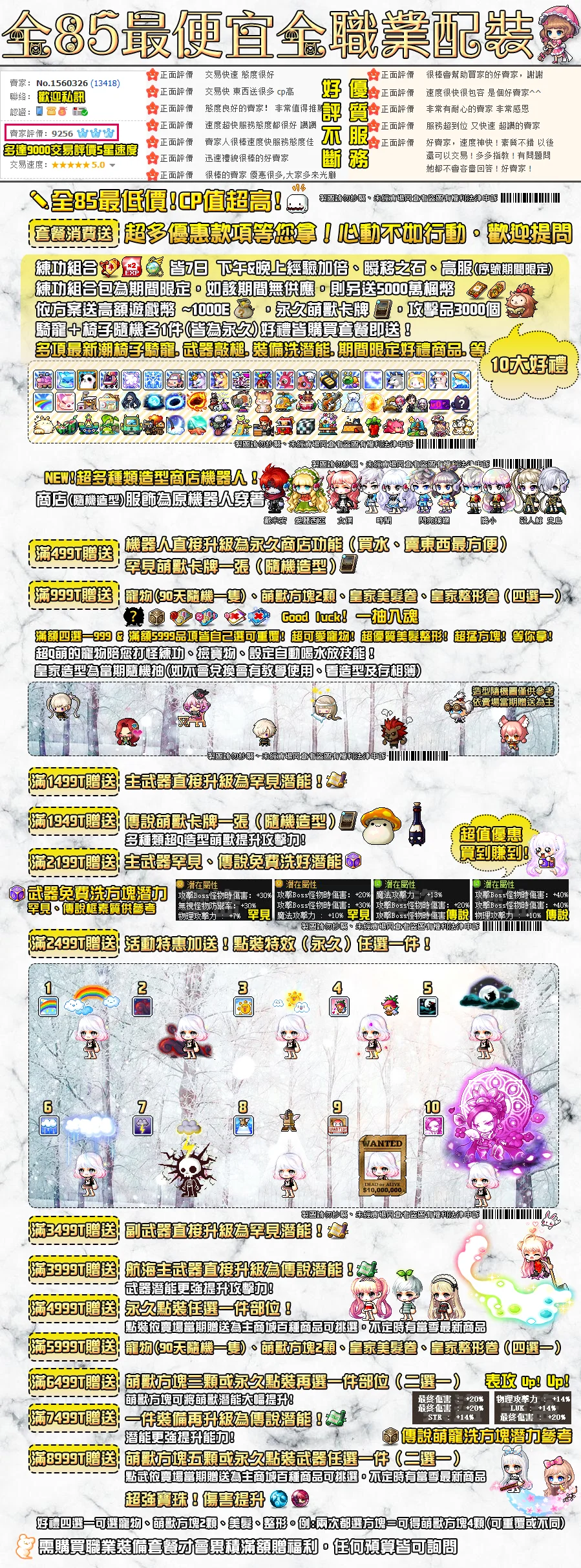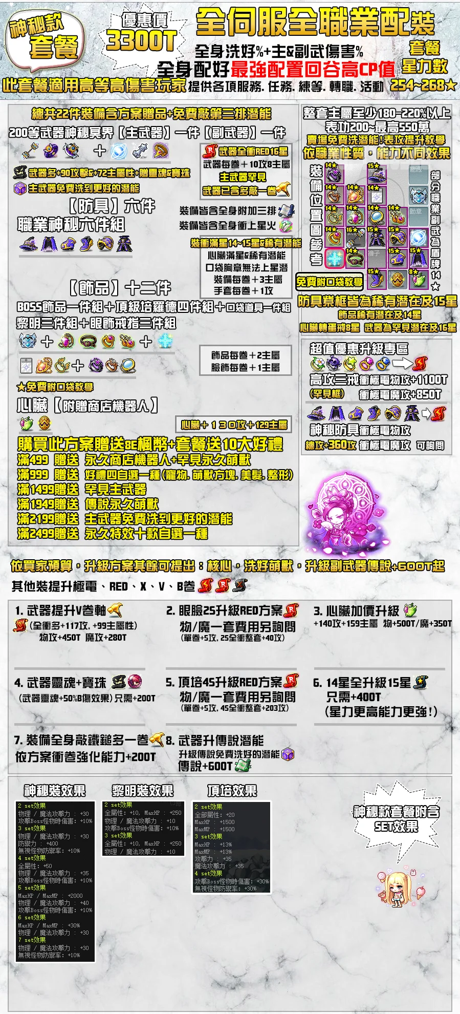 例如:伺服器:艾麗亞 職業:凱內西斯,限量款套餐,升級1.V武器+2.傳說武器+3.130魔心臟+6.升級4S頂培