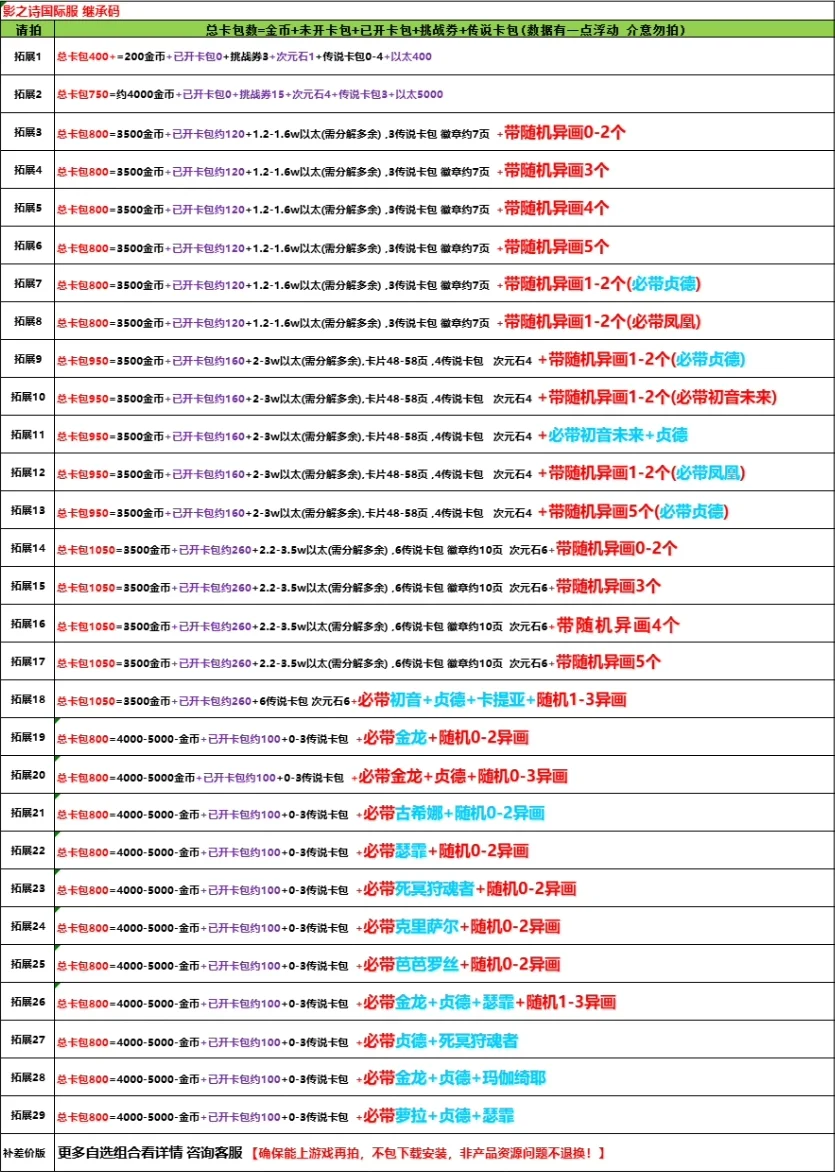 傳說包8包;十禍包35包;超越包25包;另超越已開80包;物語包20包;暗黑包47包;十天包42包;旋風包60包;命運包74包;崩壞包31包;極鬥包25包;森羅包15包;榮耀包15包;