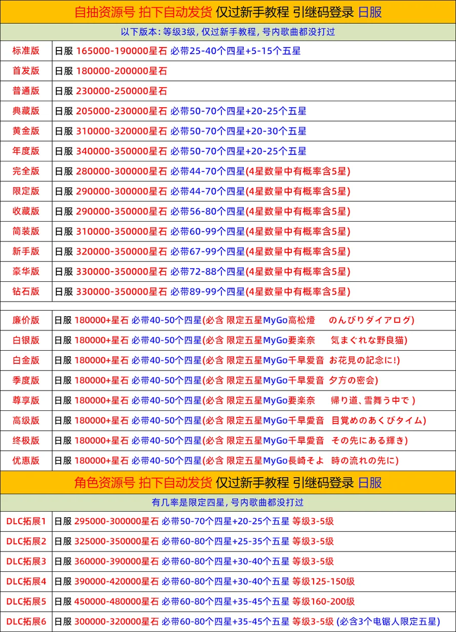 DLC2=15-25五星+50-70四星 310000~315000鑽,僅過新手教程,0進度初始號,沒有讀故事和打歌,安全不封號