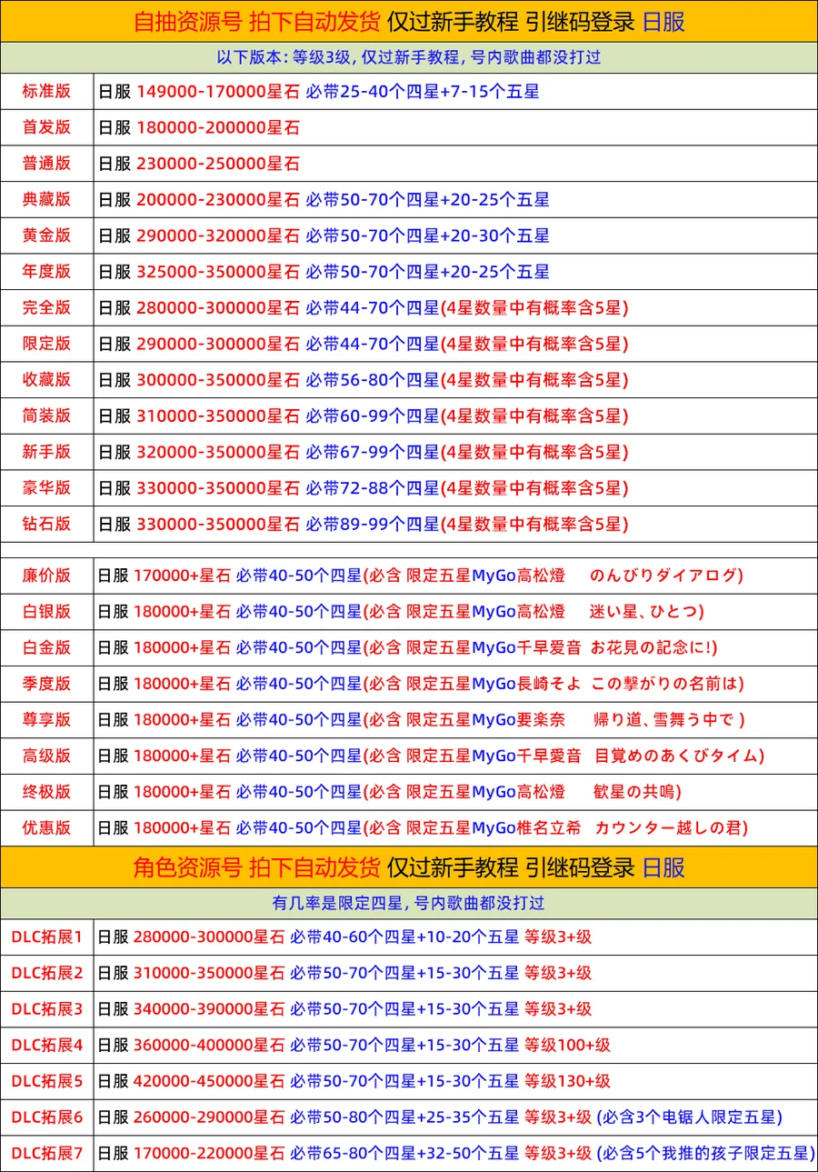 DLC3=15-25五星+50-70四星 340000~345000鑽,僅過新手教程,0進度初始號,沒有讀故事和打歌,安全不封號