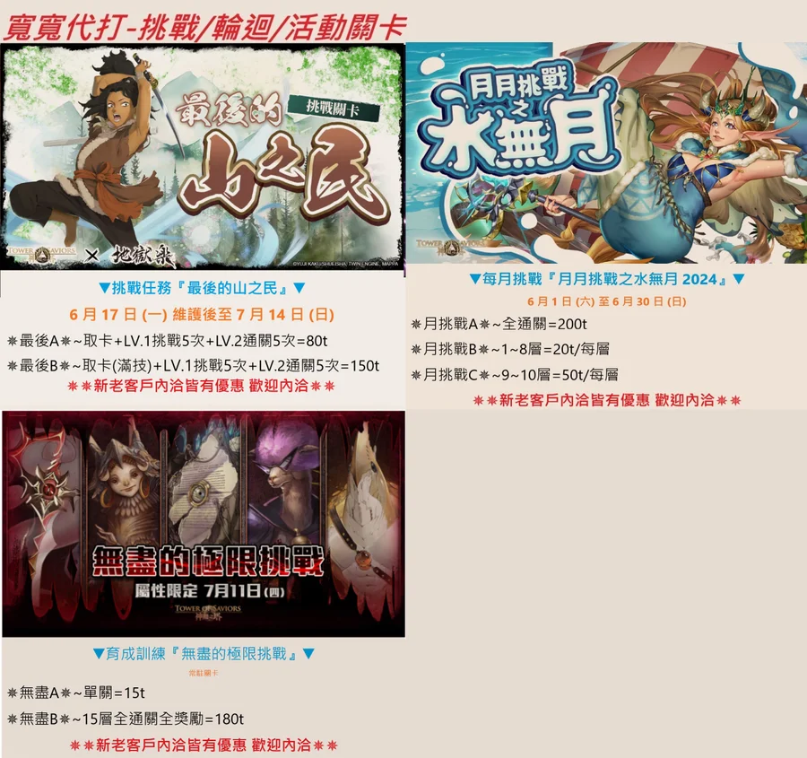 ========================== 五年老店 老字號回歸 標價7折起 未滿30t以30t計 熱門關卡的價格都在圖片上 如果需要代打其他關卡也歡迎詢問