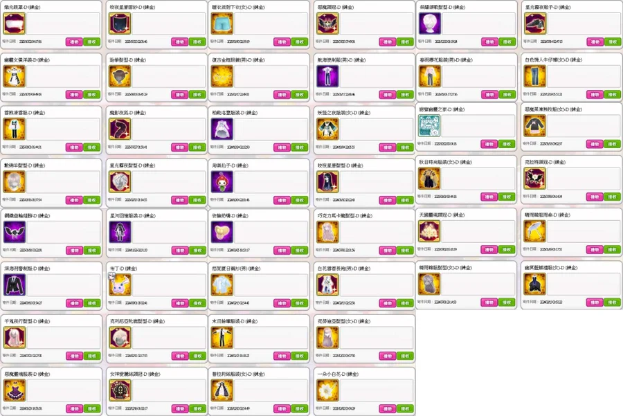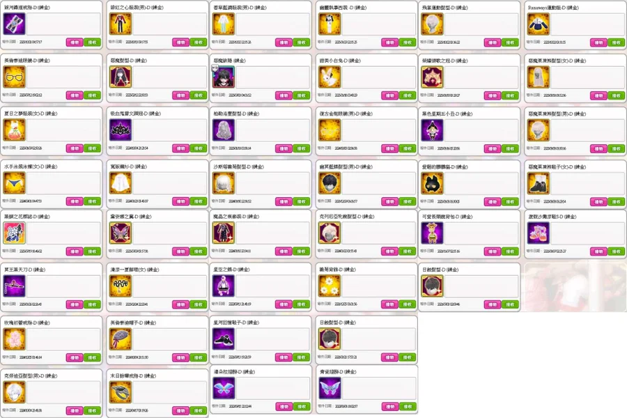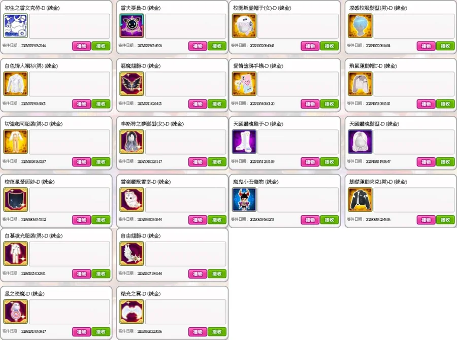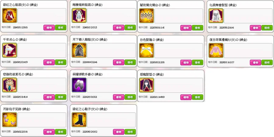 璀璨的光芒鞋子.皎月黓影髮型/衣服/鞋子/頭冠/翅膀.仙子女王翅膀.暮色夢夜翅膀.化裝舞會翅膀.女神愛麗絲翅膀.炙光之翼.變身!橡木桶.皇家公主LaLa寵物.不祥的黑暗翅膀.小黑狗.混沌.8bit小天使寵物.九尾狐影月尾巴.末日餘暉服裝.人魚少女蕾娜.星光霧夜髮型/手套.鬼靈精.凌霄花眼飾.海洋旋律圍巾.伊爾絲之冠.別西卜面具.璀璨的光芒翅膀.Project TR戒指.該隱的翅膀.炫光閃耀手環.星河回憶服裝.白色情人男友襯衫(女).童話月桂冠.死亡騎士翅膀.紫色煙火髮型.水母少女柔娜.混沌.榮耀頌歌髮型.化裝舞會王冠.珍奶白熊.榮耀頌歌手套.混沌.焰王赤月刀.星河回憶服裝.夏日時尚服裝(女).榮耀頌歌鞋子.人魚少女蕾娜.梅賽德斯翅膀.英倫泰迪服裝x2.皇家公主LaLa寵物.炫光閃耀手環.復古荷葉邊襯衫(女).千年雪狐.紫色煙火鞋子.人魚少女蕾娜.白色情人男友襯衫(女).赤腳(女).愛戀時刻外套.悠閒夏日背心(女).紫色煙火髮型.甜蜜幽靈之家.皇家仙子國王禮服.綠焰鞋子.紫色煙火髮型.千年的太陽陽焰.墮落天使的頭冠.棉花糖睡衣髮型(女).甜蜜幽靈之家.綠焰髮型/鞋子.邪惡深淵寵物.綠焰鞋子.