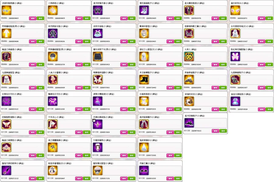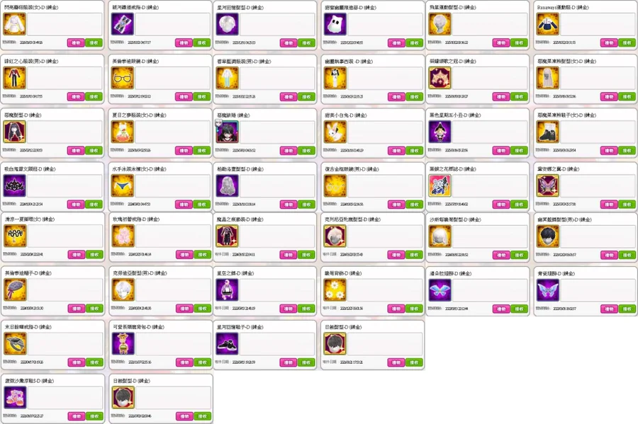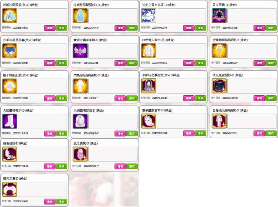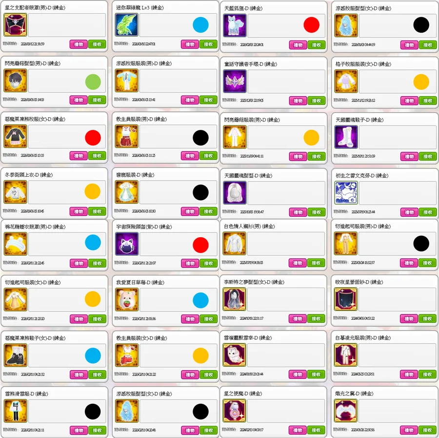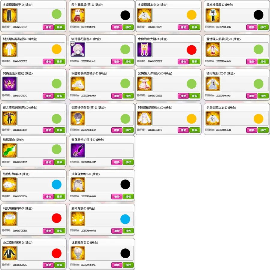 璀璨的光芒鞋子.皎月黓影髮型/衣服/鞋子/頭冠/翅膀.仙子女王翅膀.暮色夢夜翅膀.化裝舞會翅膀.女神愛麗絲翅膀.炙光之翼.變身!橡木桶.皇家公主LaLa寵物.不祥的黑暗翅膀.8bit小天使寵物.人魚少女蕾娜.星光霧夜髮型/手套.海洋旋律圍巾.璀璨的光芒翅膀.該隱的翅膀.炫光閃耀手環.星河回憶服裝.白色情人男友襯衫(女).童話月桂冠.死亡騎士翅膀.紫色煙火髮型.水母少女柔娜.混沌.榮耀頌歌髮型.珍奶白熊.榮耀頌歌手套.混沌.焰王赤月刀.星河回憶服裝.夏日時尚服裝(女).榮耀頌歌鞋子.人魚少女蕾娜.梅賽德斯翅膀.英倫泰迪服裝x2.皇家公主LaLa寵物.炫光閃耀手環.復古荷葉邊襯衫(女).千年雪狐.紫色煙火鞋子.人魚少女蕾娜.白色情人男友襯衫(女).赤腳(女).愛戀時刻外套.悠閒夏日背心(女).紫色煙火髮型.甜蜜幽靈之家.皇家仙子國王禮服.綠焰鞋子.紫色煙火髮型.千年的太陽陽焰.墮落天使的頭冠.棉花糖睡衣髮型(女).甜蜜幽靈之家.綠焰髮型/鞋子.邪惡深淵寵物.綠焰鞋子.冥王黑天刀.飛鼠運動帽T.魔術白貓.自由翅膀.雷夫要員.光之聖核.黑色星期五小丑.惡魔該隱.