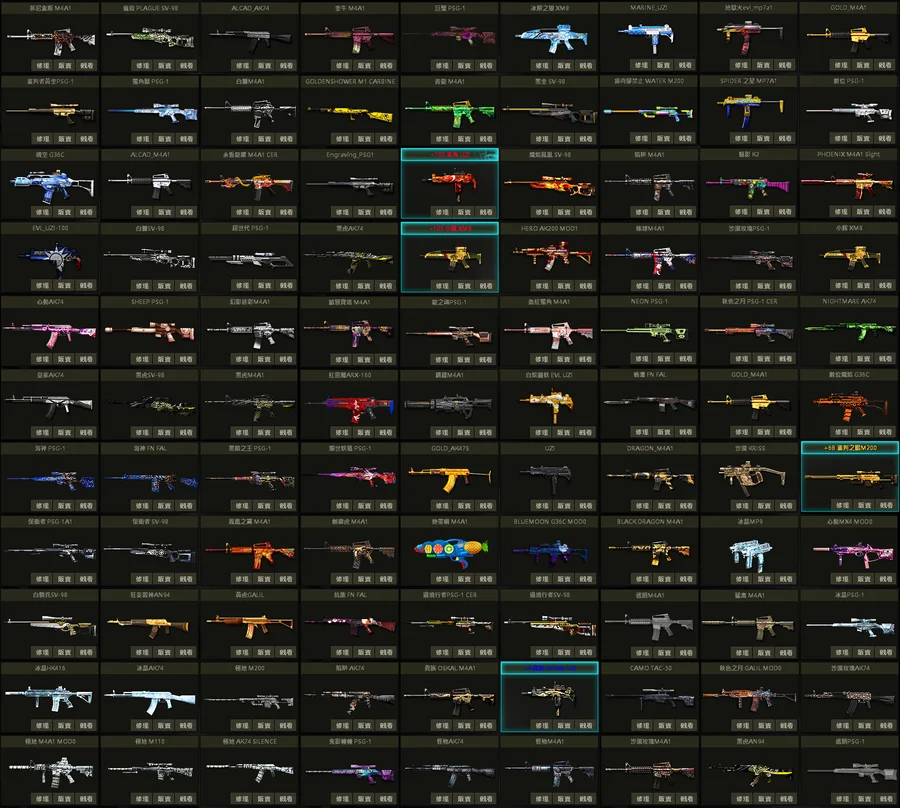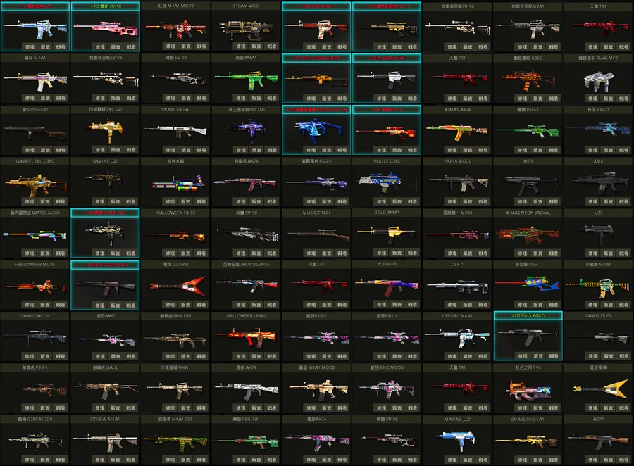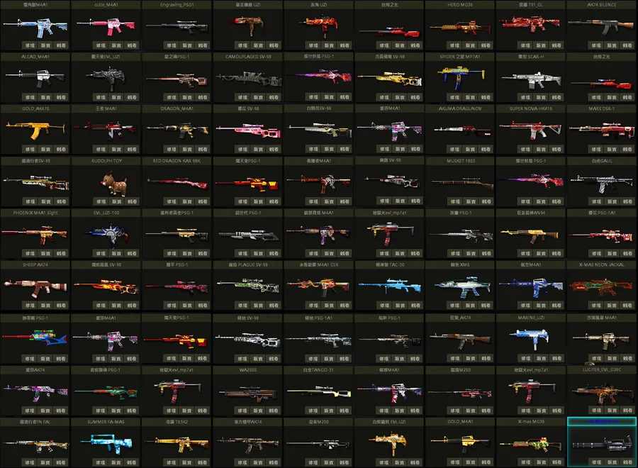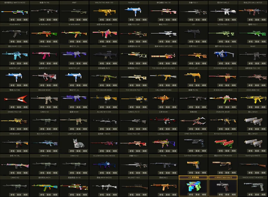 超世代P、那迦P、貴族P、白蛇U、狂戰U、櫻花U、乳牛狙、鋼鐵人AK200mod、動物灰貓