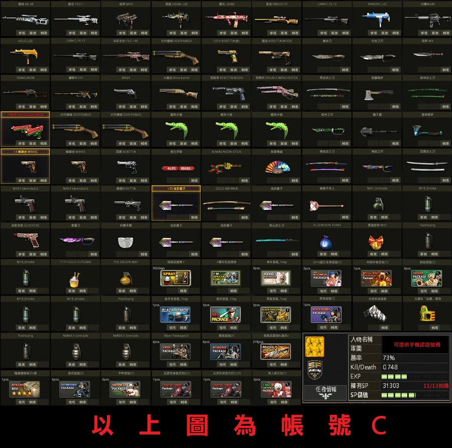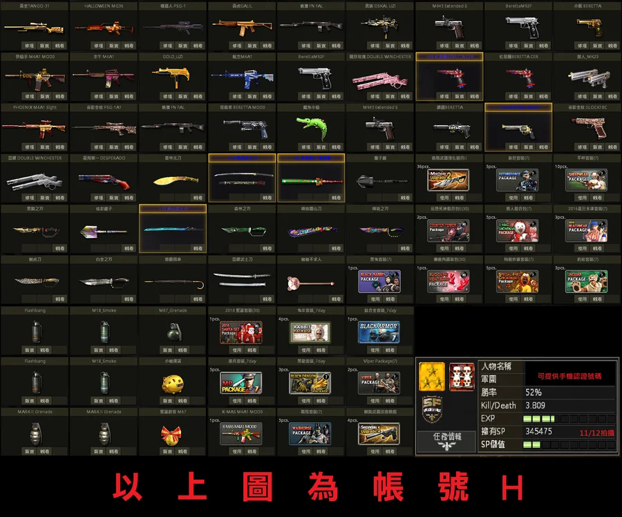 【稀有紫靈刀、櫻花藍獨角M、白金黃金P、爪黃鋼鐵SV、原木星際XM8、黃金手銬槍套2周T】