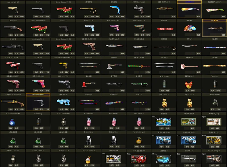 原木XM8、星際XM8、白蛇U、櫻花U、饕餮AK、紫靈刀、武士刀、2周T、黃金槍套、黃金手銬