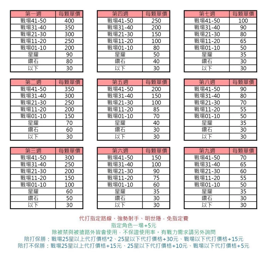 鑽石5-星耀=750、星耀5-戰場=875、戰場1-璀璨=2950前職業選手操刀
