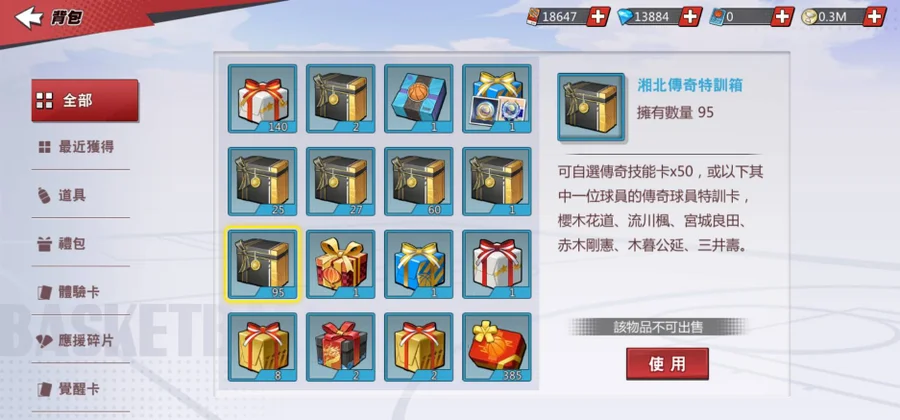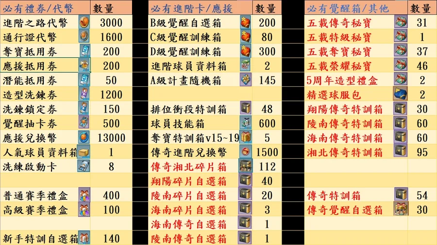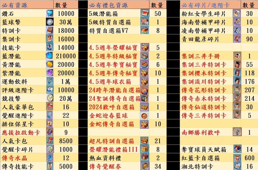 (十三)5週年各式禮包/4.5週年各式禮包/4.5週年傳奇秘寶箱/金蛇傳奇自選箱/超凡特訓自選箱/湘北傳奇特訓箱/傳奇特訓箱/翔陽傳奇特訓箱/