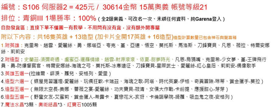 編號:S106 伺服器2 = 425元 / 30614金幣 15萬奧義 帳號等級21