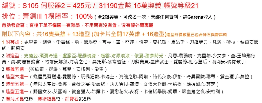 編號:S105 伺服器2 = 425元 / 31190金幣 15萬奧義 帳號等級21