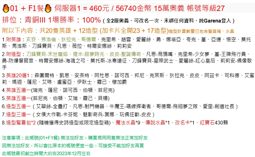 注意事項:此帳號(01+F1餐) 無法加好友,購買視同同意無法正常加好友