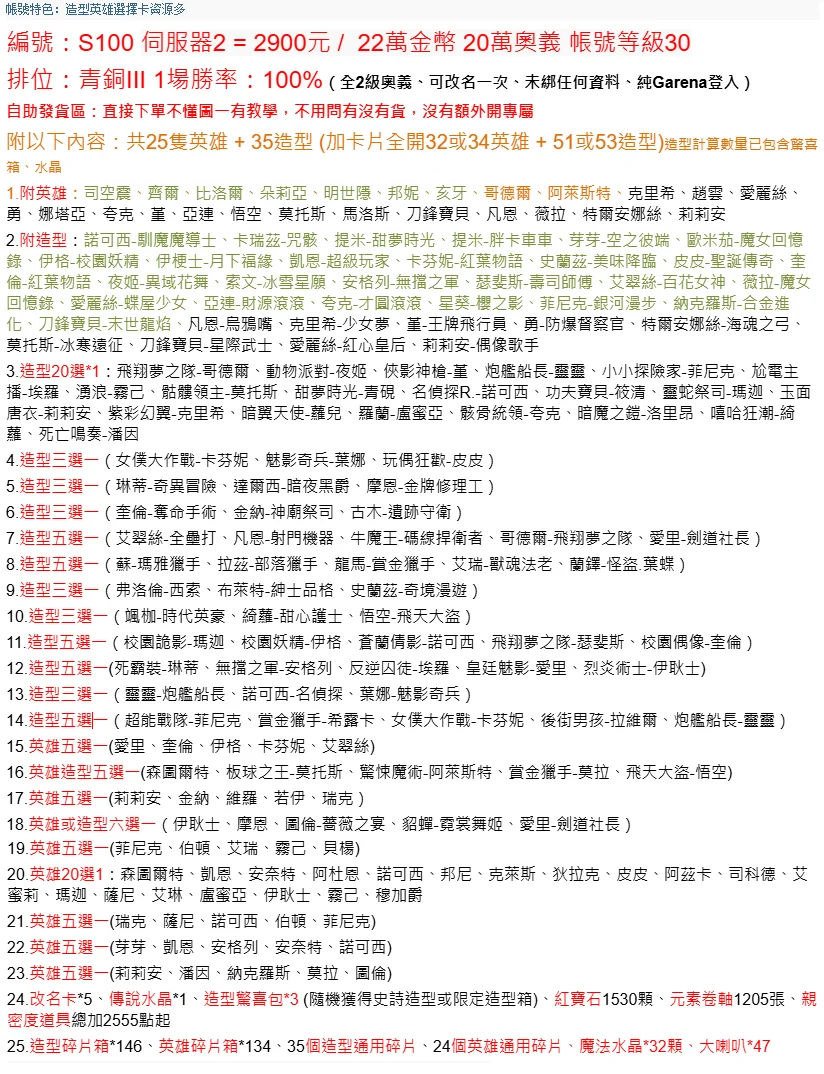 編號:S100 伺服器2 = 2900元 / 22萬金幣 20萬奧義 帳號等級30