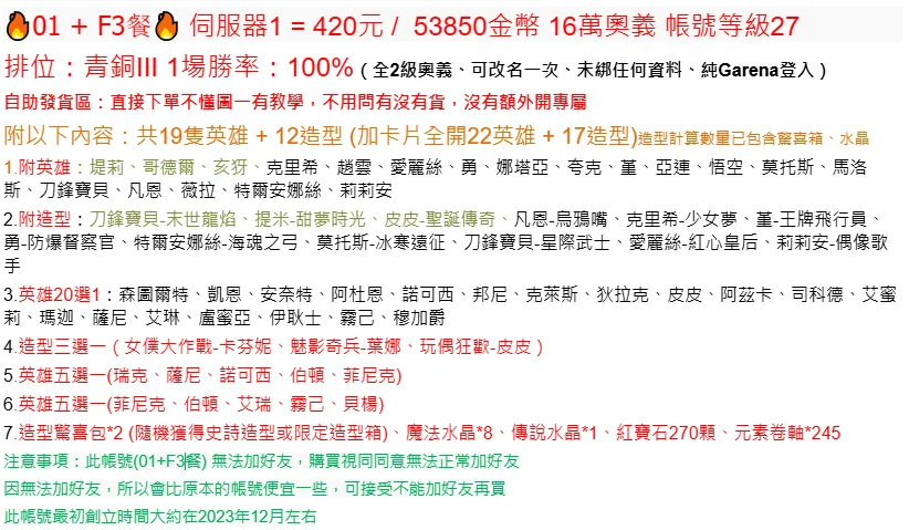 注意事項:此帳號(01+F3餐) 無法加好友,購買視同同意無法正常加好友