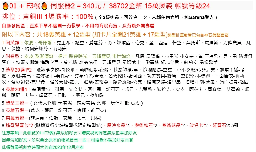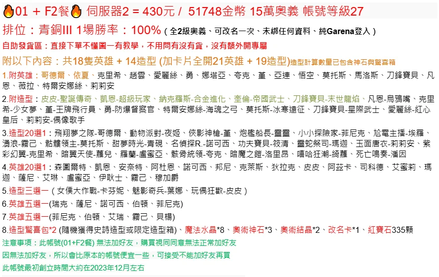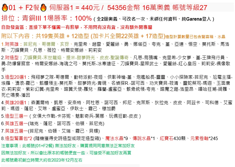 1.無包售後,帳號交出後很難查證遊戲過程且遊戲規章已寫明,下單視同同意需自行承擔風險