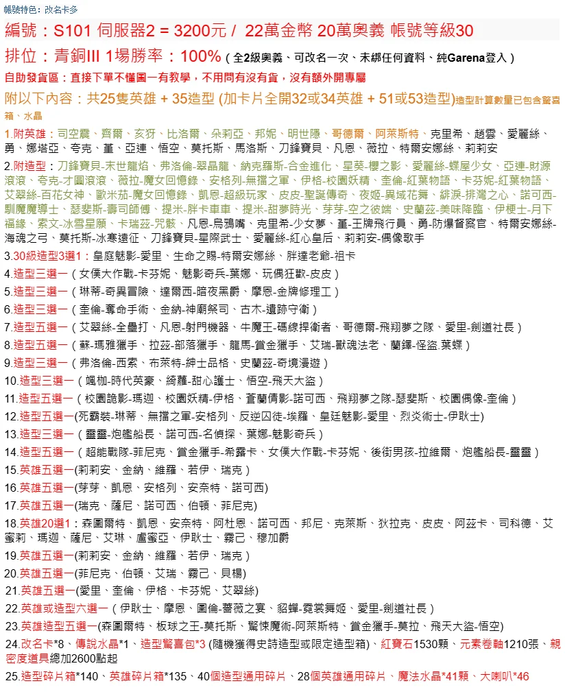 編號:S101 伺服器2 = 3200元 / 22萬金幣 20萬奧義 帳號等級30