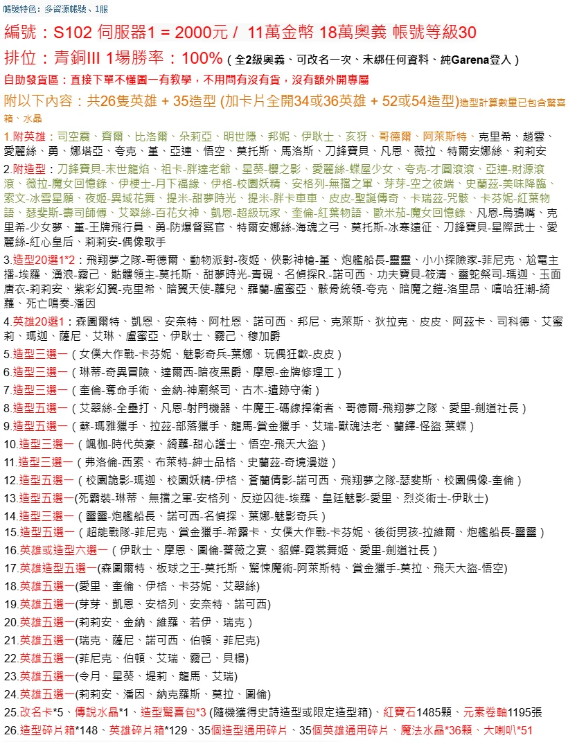編號:S102 伺服器1 = 2000元 / 11萬金幣 18萬奧義 帳號等級30