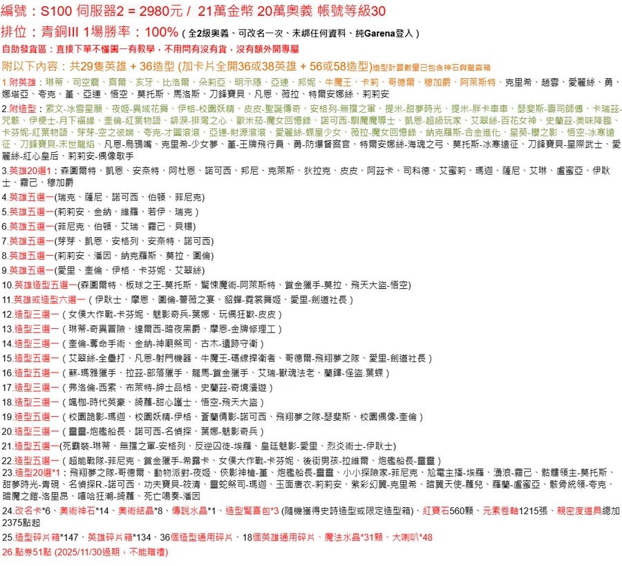 附以下內容:共29隻英雄 + 36造型 (加卡片全開36或38英雄 + 56或58造型)造型計算數量已包含神石與驚喜箱