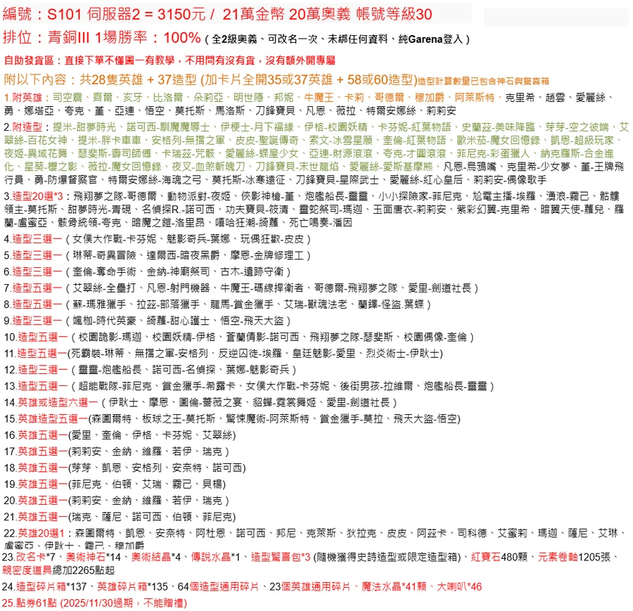 編號:S101 伺服器2 = 3150元 / 21萬金幣 20萬奧義 帳號等級30