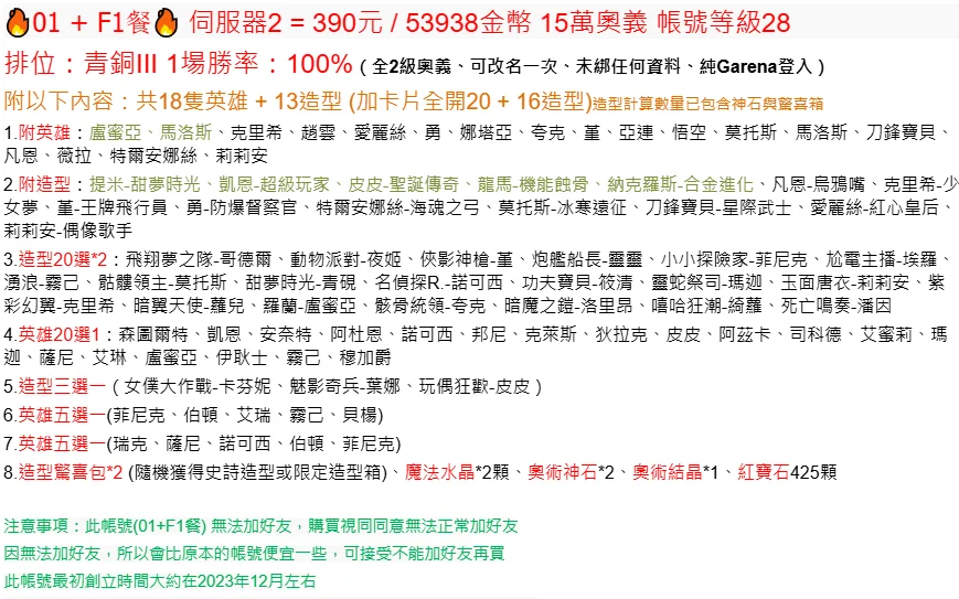 🔥01 + F1餐🔥 伺服器2 = 390元 / 53938金幣 15萬奧義 帳號等級28