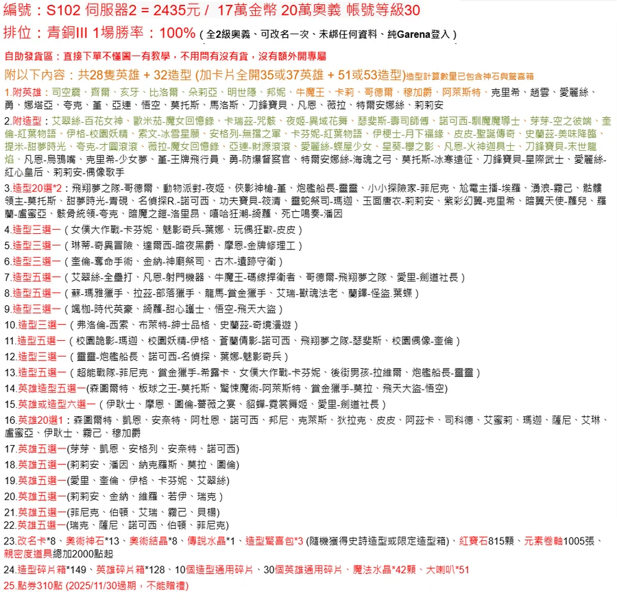 編號:S102 伺服器2 = 2435元 / 17萬金幣 20萬奧義 帳號等級30