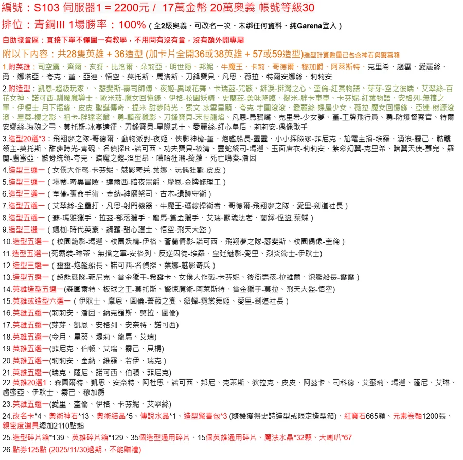 編號:S103 伺服器1 = 2200元 / 17萬金幣 20萬奧義 帳號等級30