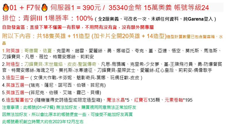 注意事項:此帳號(01+F7餐) 無法加好友,購買視同同意無法正常加好友