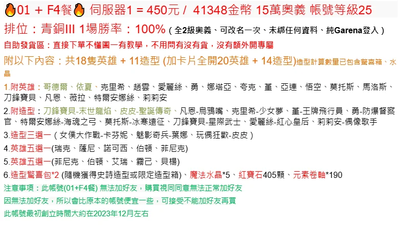 注意事項:此帳號(01+F4餐) 無法加好友,購買視同同意無法正常加好友
