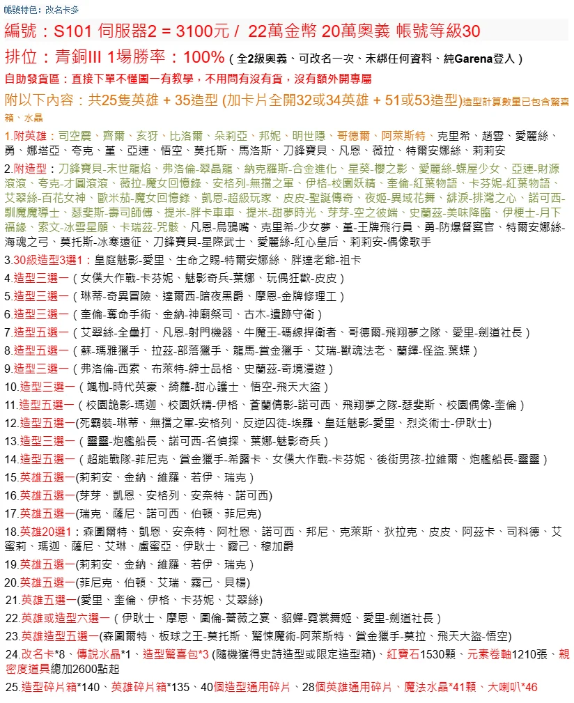 編號:S101 伺服器2 = 3100元 / 22萬金幣 20萬奧義 帳號等級30