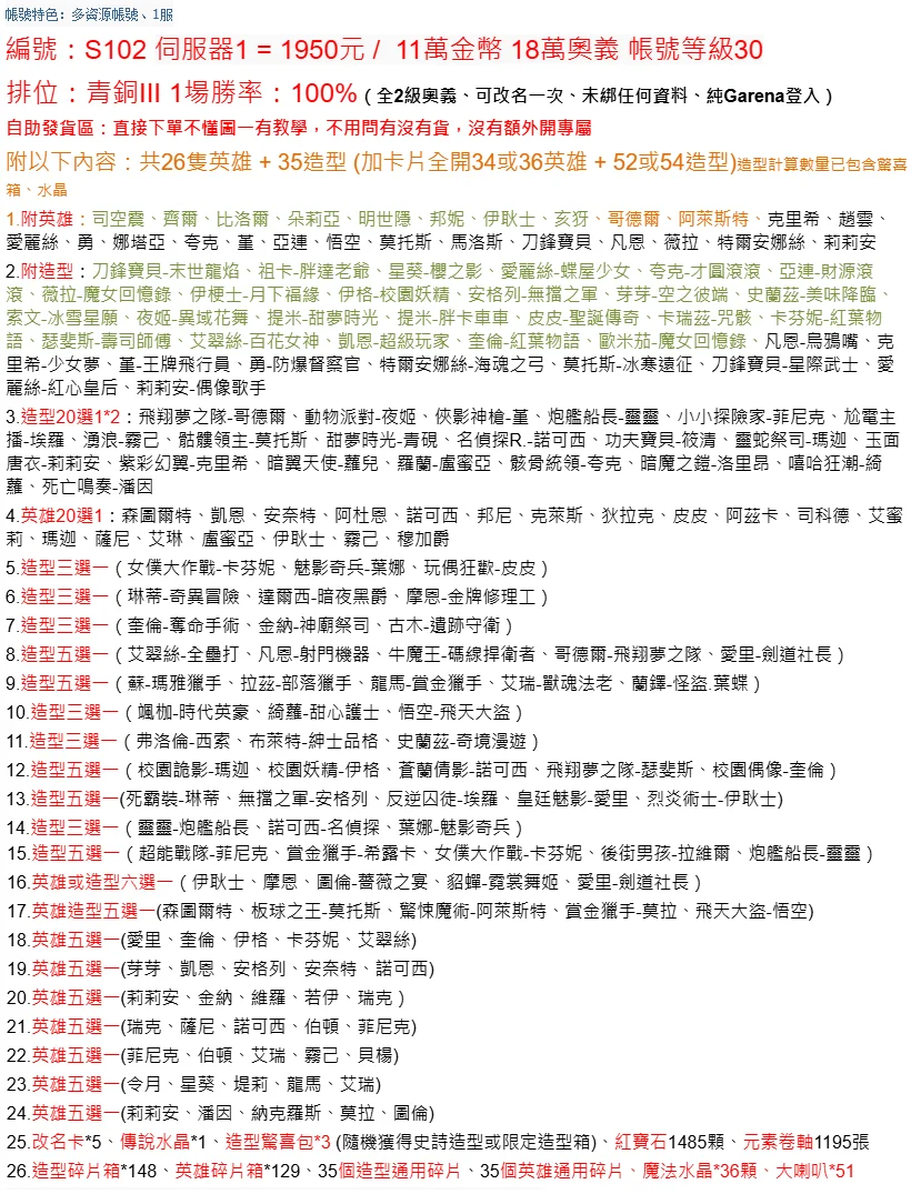 編號:S102 伺服器1 = 1950元 / 11萬金幣 18萬奧義 帳號等級30