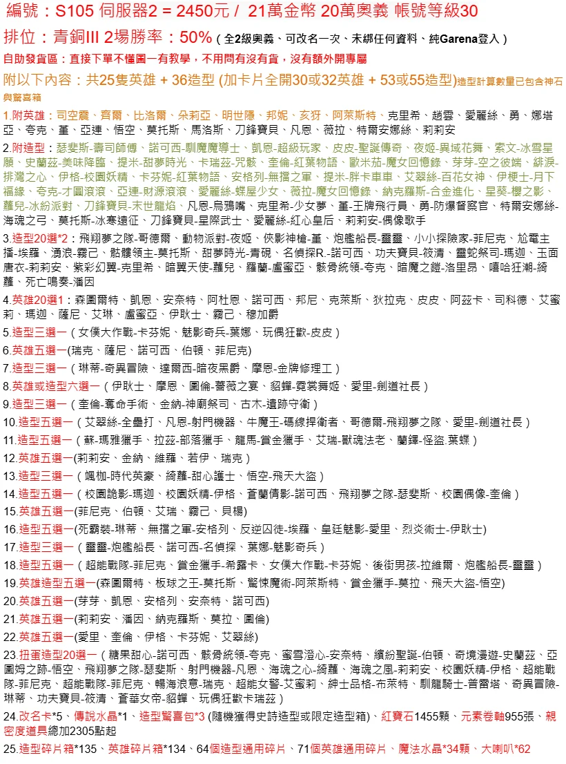 編號:S105 伺服器2 = 2450元 / 21萬金幣 20萬奧義 帳號等級30
