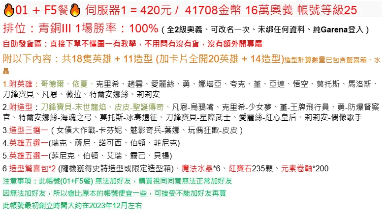 注意事項:此帳號(01+F5餐) 無法加好友,購買視同同意無法正常加好友