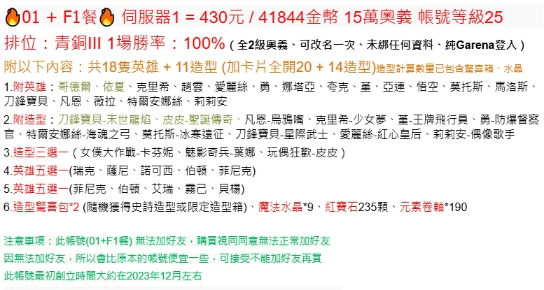 注意事項:此帳號(01+F1餐) 無法加好友,購買視同同意無法正常加好友