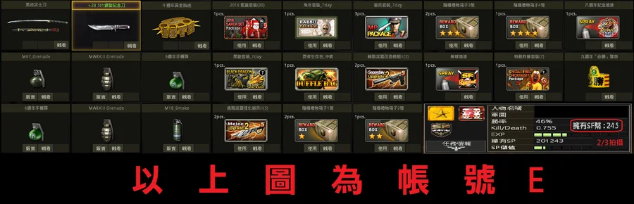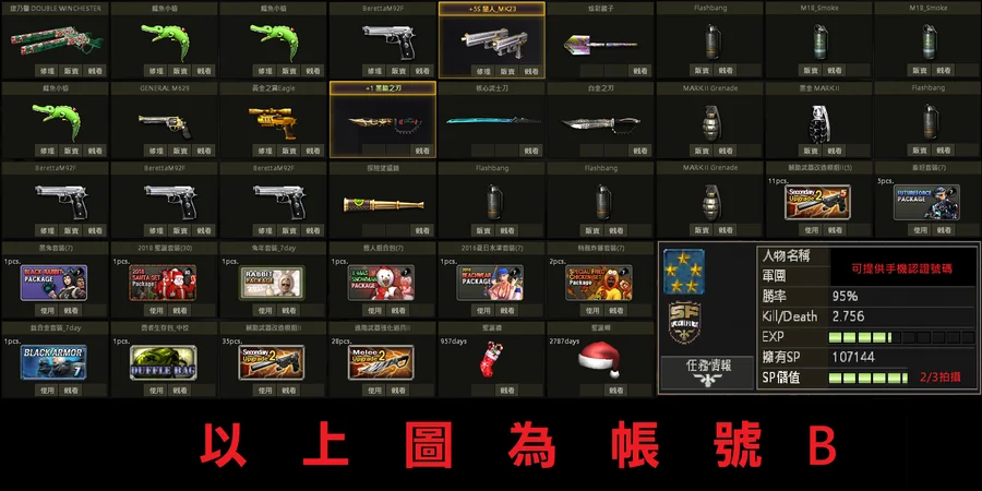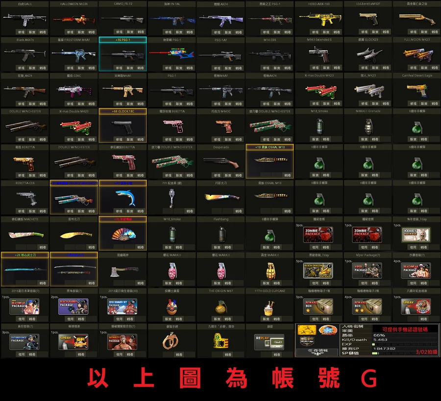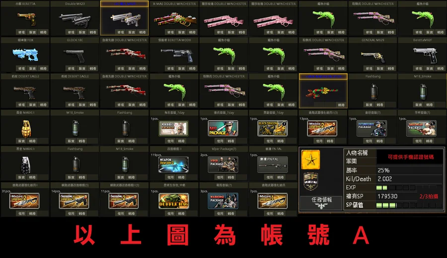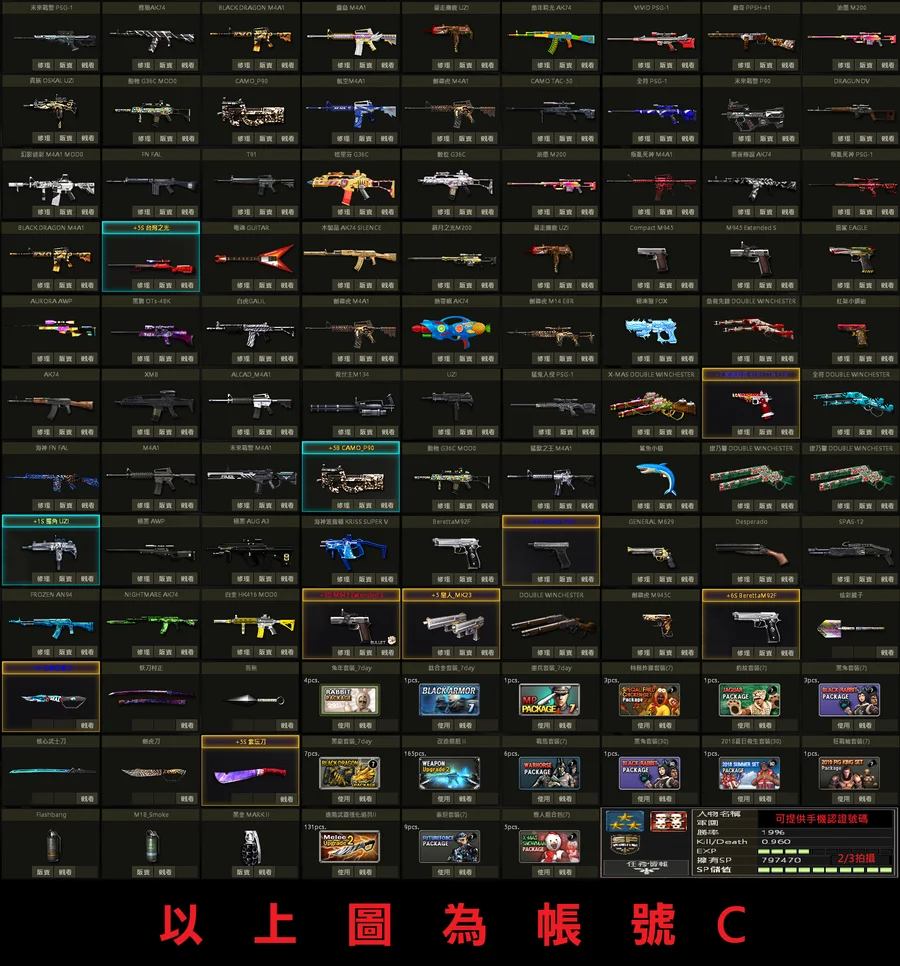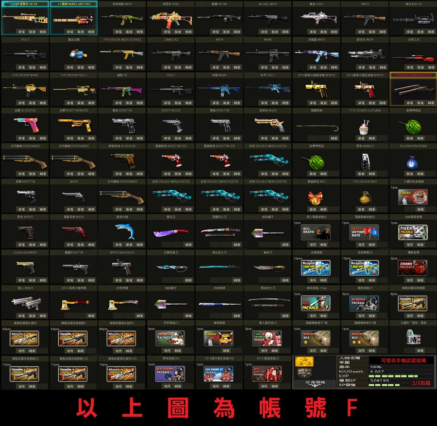 【百樂透老帳、七彩M9、櫻花菲尼美國M、瘟疫奧創SV、白金黃金P、百年U、格林水槍】