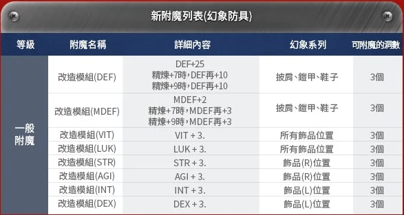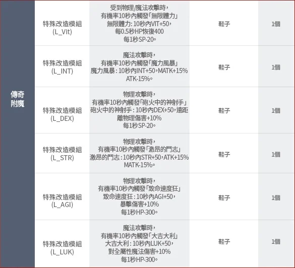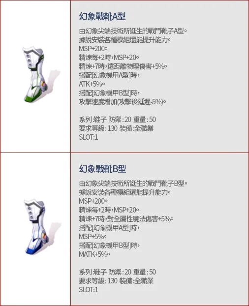 幻象戰靴A、B➔L_STR、L_AGI、L_VIT、L_INT、L_DEX、L_LUK、Fix、MHP、MSP、Heal、DEF、MDEF