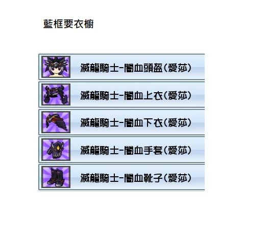 *封印、衣櫥可我出 商城價:D*實收:D【艾索德】海灘遊艇風 整套(絕版時裝)600 萬聖節暗影伯爵 整套(絕版時裝)600【澄】冰鑽獨角獸左4 200【愛莎】滅龍騎士-闇血(紫)左5 200【共通物】1.魔龍:手臂.臉中.尾巴 2002.(舊)魔龍:尾巴.頭盔.翅膀 1003.藏炎左4 200〈售出〉