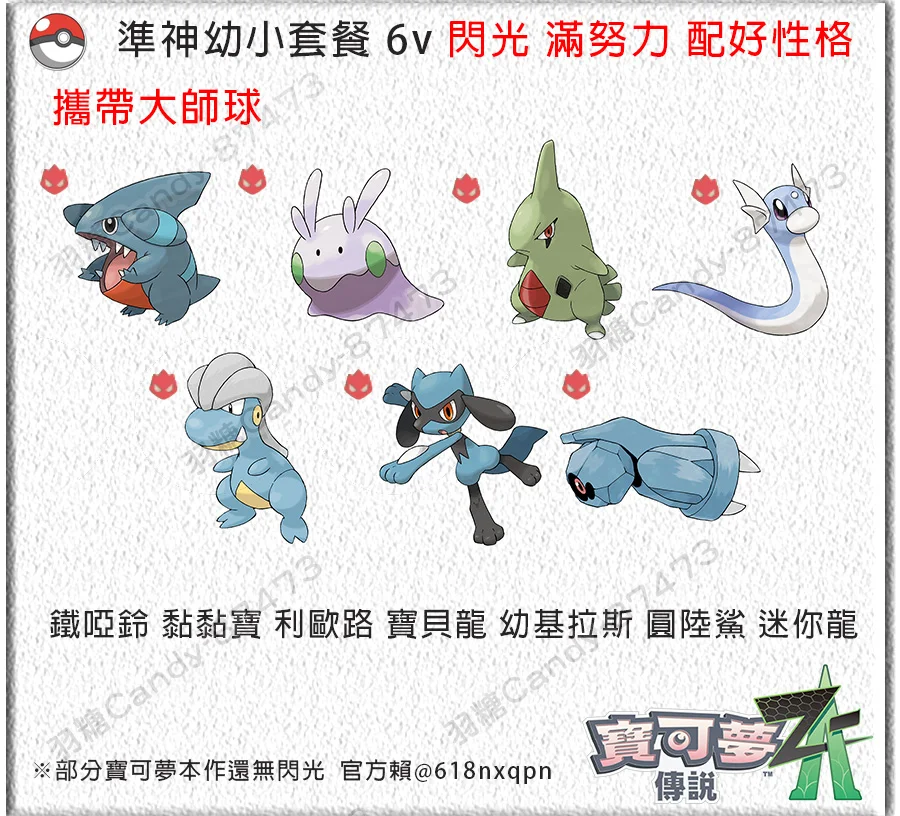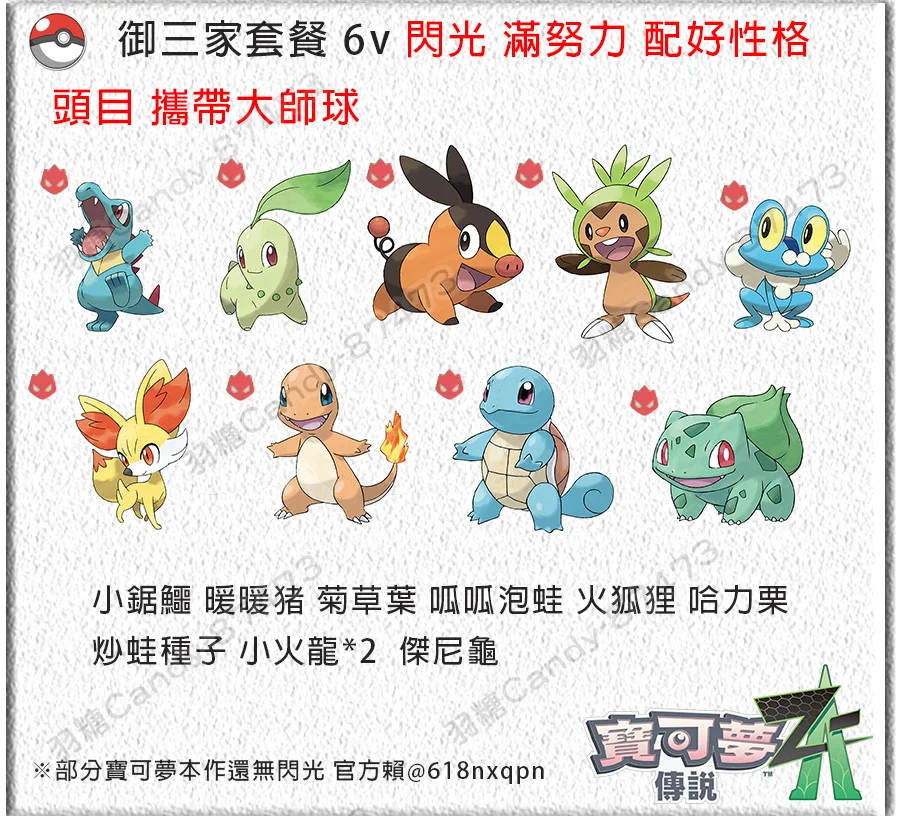 .《閃光禦三家套餐》 滿糖 配好性格努力 初階LV.5 色違 全6V 150*元 (3隻)