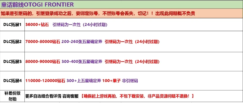遊戲帳號內容已清楚打出來 沒打出來的皆為隨機附送 不要自己亂加東西 資源 再說帳號上怎沒有 後續出現問題 一律以賣家公布為主 介意勿買 帳號一律不幫留 專屬是方便購買 不是幫留 如果下單後 沒帳號 一律換組或不互評退款 購買表示同意 介意勿買 若需綁定個人訊息或遊玩 如手機 身分證 或是 下載遊戲 VPN 等 請自行綁定或GOOGLE 不能綁定者或無法遊玩者 無法退款 介意勿買 購買後 諾帳號 信箱 手機 VPN 等帳號安全性相關 需要額外花費 才能改密或者遊玩 綁定私人個資等問題 賣家無權處理綁定 或者代付 故若交易後有需額外支出 不能綁定不能修改密碼者或無法遊玩者 請買家自行處理 請自行付款 購買表示同意 無法退款 介意勿買 例如 陸服需要綁定到大陸的手機/信箱等個人資料,需要自行綁定,賣家無法提供,如果沒有大陸資料可以綁定 請謹慎購買 温馨提醒:本店杜絕修改,敬请安心購買,請杜絕修改商家,以避免導致自身錢貨兩空,關心您 下標繳費後,會在交易留言板留帳密給買家。 為避免交易糾,請務必確認賣場商品再下標,一旦購買繳費後,均不接受取消交易哦,無法認同者請勿下標! 此為虚擬商品,不支持七天鑑賞期,如介意請勿購買。 ※此場可以直接下標感謝您的支持