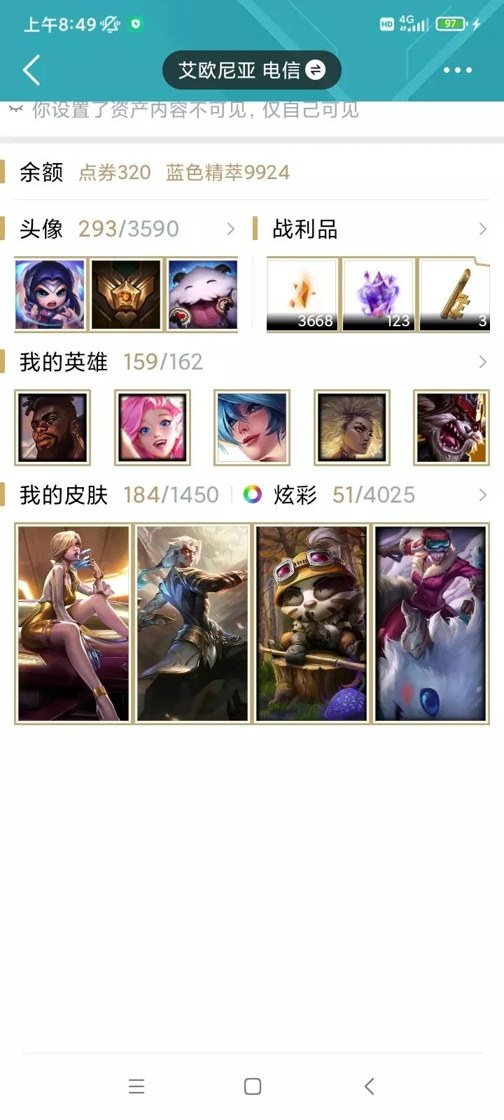 英雄數量:162 皮膚數量:174 服務器:艾歐尼亞