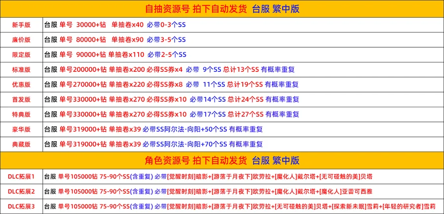 遊戲帳號內容已清楚打出來 沒打出來的皆為隨機附送 不要自己亂加東西 資源 再說帳號上怎沒有 後續出現問題 一律以賣家公布為主 介意勿買 帳號一律不幫留 專屬是方便購買 不是幫留 如果下單後 沒帳號 一律換組或不互評退款 購買表示同意 介意勿買 若需綁定個人訊息或遊玩 如手機 身分證 或是 下載遊戲 VPN 等 請自行綁定或GOOGLE 不能綁定者或無法遊玩者 無法退款 介意勿買 温馨提醒:本店杜絕修改,敬请安心購買,請杜絕修改商家,以避免導致自身錢貨兩空,關心您 下標繳費後,會在交易留言板留帳密給買家。 為避免交易糾,請務必確認賣場商品再下標,一旦購買繳費後,均不接受取消交易哦,