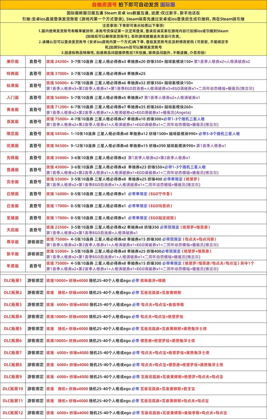 遊戲帳號內容已清楚打出來 沒打出來的皆為隨機附送 不要自己亂加東西 資源 再說帳號上怎沒有 後續出現問題 一律以賣家公布為主 介意勿買 帳號一律不幫留 專屬是方便購買 不是幫留 如果下單後 沒帳號 一律換組或不互評退款 購買表示同意 介意勿買 若需綁定個人訊息或遊玩 如手機 身分證 或是 下載遊戲 VPN 等 請自行綁定或GOOGLE 不能綁定者或無法遊玩者 無法退款 介意勿買 温馨提醒:本店杜絕修改,敬请安心購買,請杜絕修改商家,以避免導致自身錢貨兩空,關心您 下標繳費後,會在交易留言板留帳密給買家。 為避免交易糾,請務必確認賣場商品再下標,一旦購買繳費後,均不接受取消交易哦,