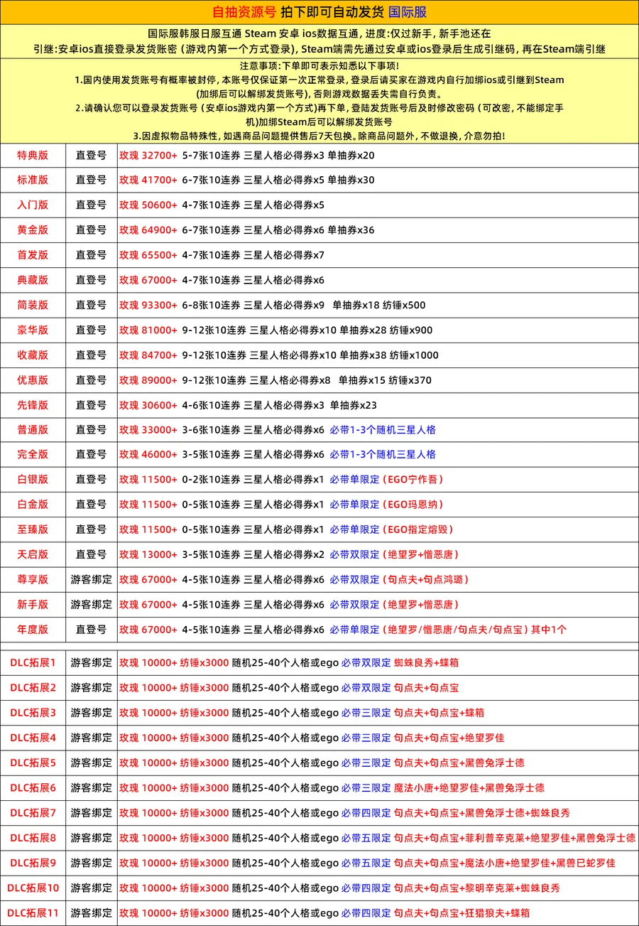 遊戲帳號內容已清楚打出來 沒打出來的皆為隨機附送 不要自己亂加東西 資源 再說帳號上怎沒有 後續出現問題 一律以賣家公布為主 介意勿買 帳號一律不幫留 專屬是方便購買 不是幫留 如果下單後 沒帳號 一律換組或不互評退款 購買表示同意 介意勿買 若需綁定個人訊息或遊玩 如手機 身分證 或是 下載遊戲 VPN 等 請自行綁定或GOOGLE 不能綁定者或無法遊玩者 無法退款 介意勿買 温馨提醒:本店杜絕修改,敬请安心購買,請杜絕修改商家,以避免導致自身錢貨兩空,關心您 下標繳費後,會在交易留言板留帳密給買家。 為避免交易糾,請務必確認賣場商品再下標,一旦購買繳費後,均不接受取消交易哦,
