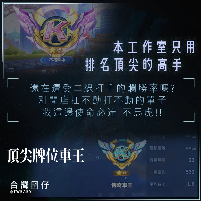 👉是真正在季初就打上不朽車神&最強車神的團隊,旗下作業跑者也都是台服&國服/王者車手&傳奇車王🏆