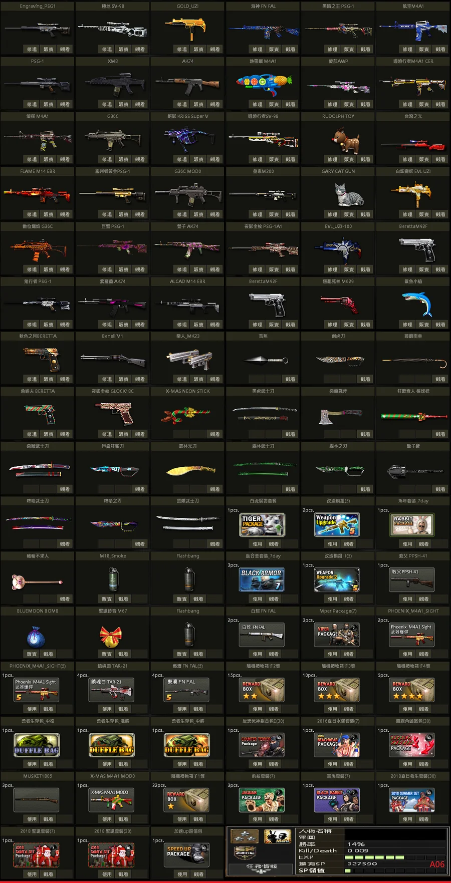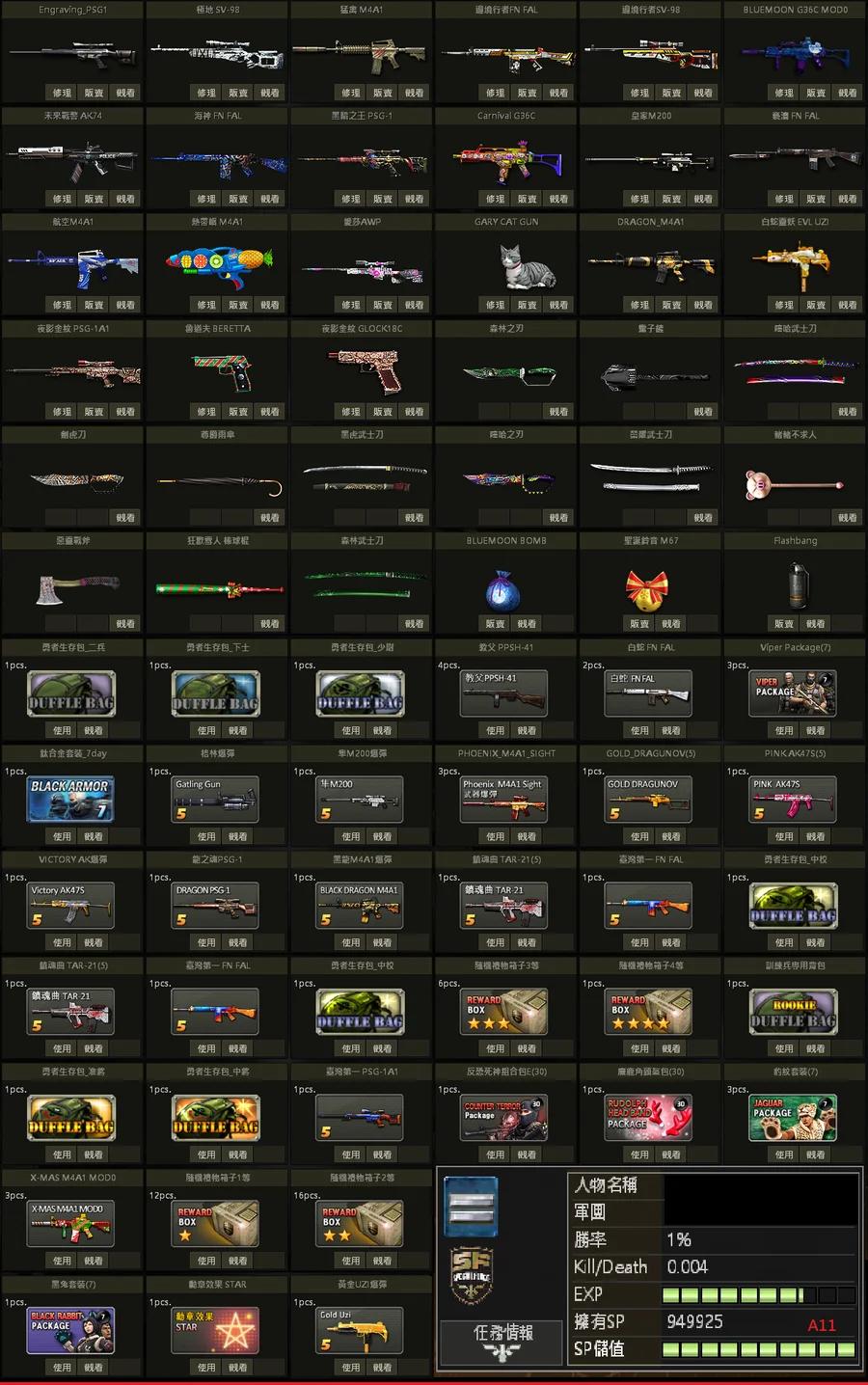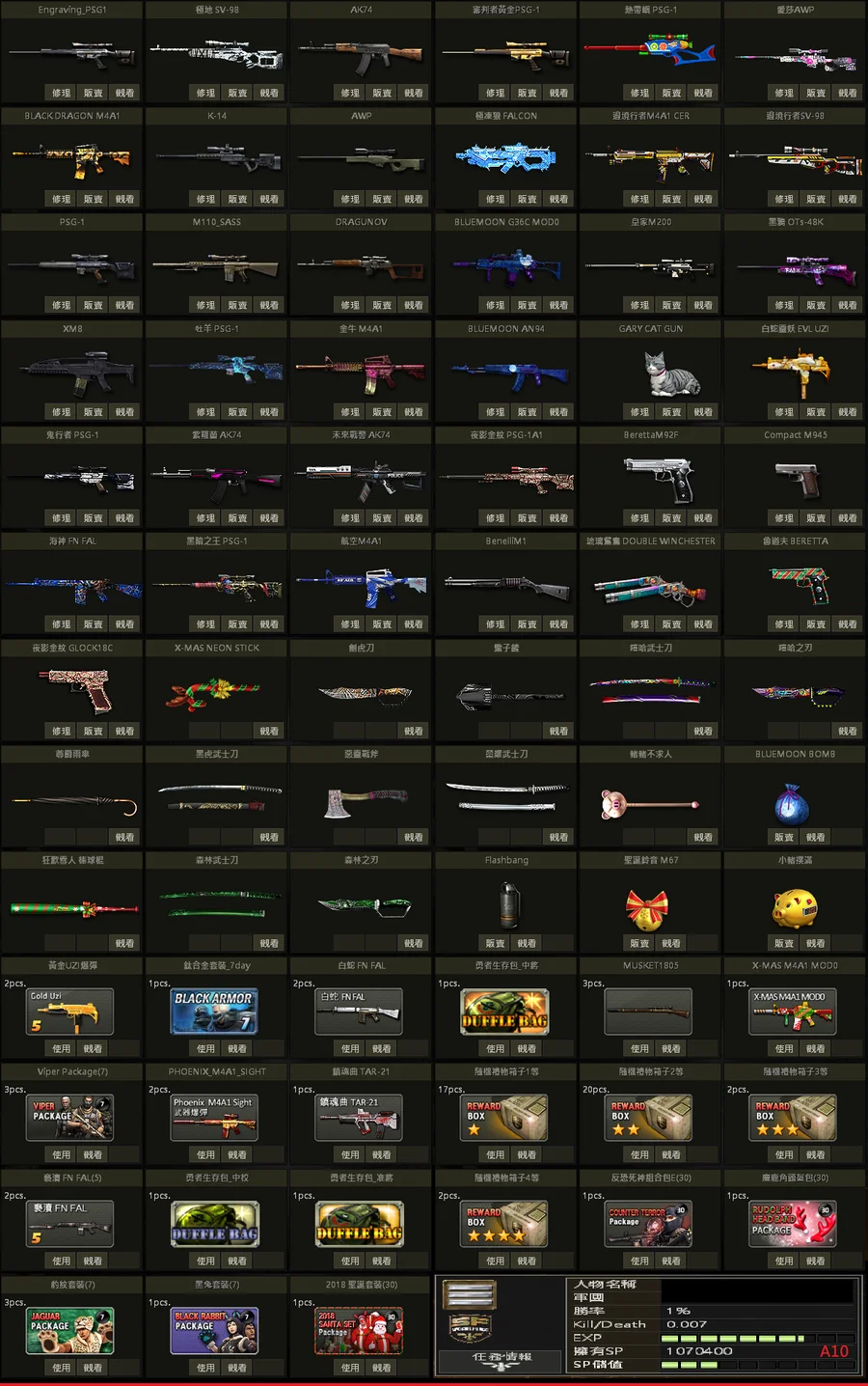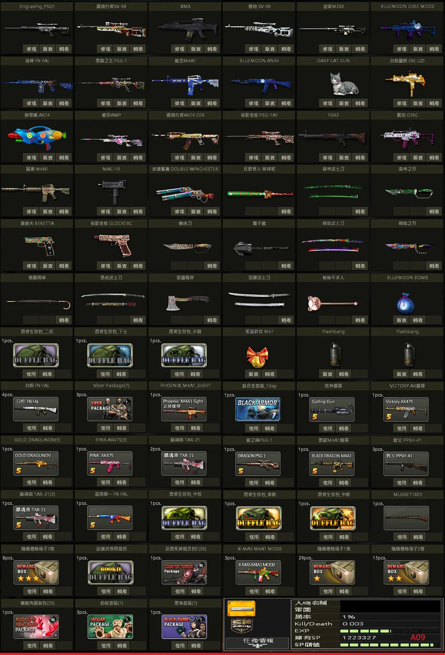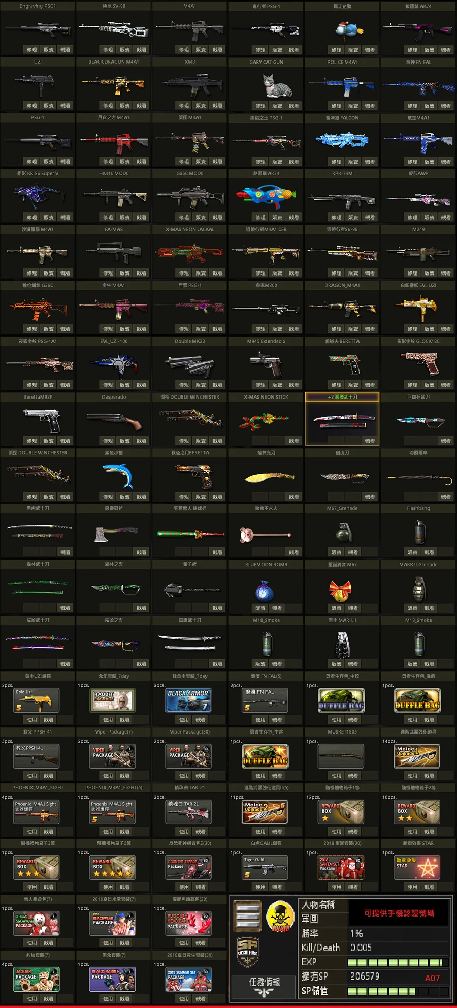 二星棕、白金P、黃金P、邊境SV、極地SV、金龍M、不朽者M、極凍狼TAC、百年U、白蛇U、格林水槍、武士刀、白金刃